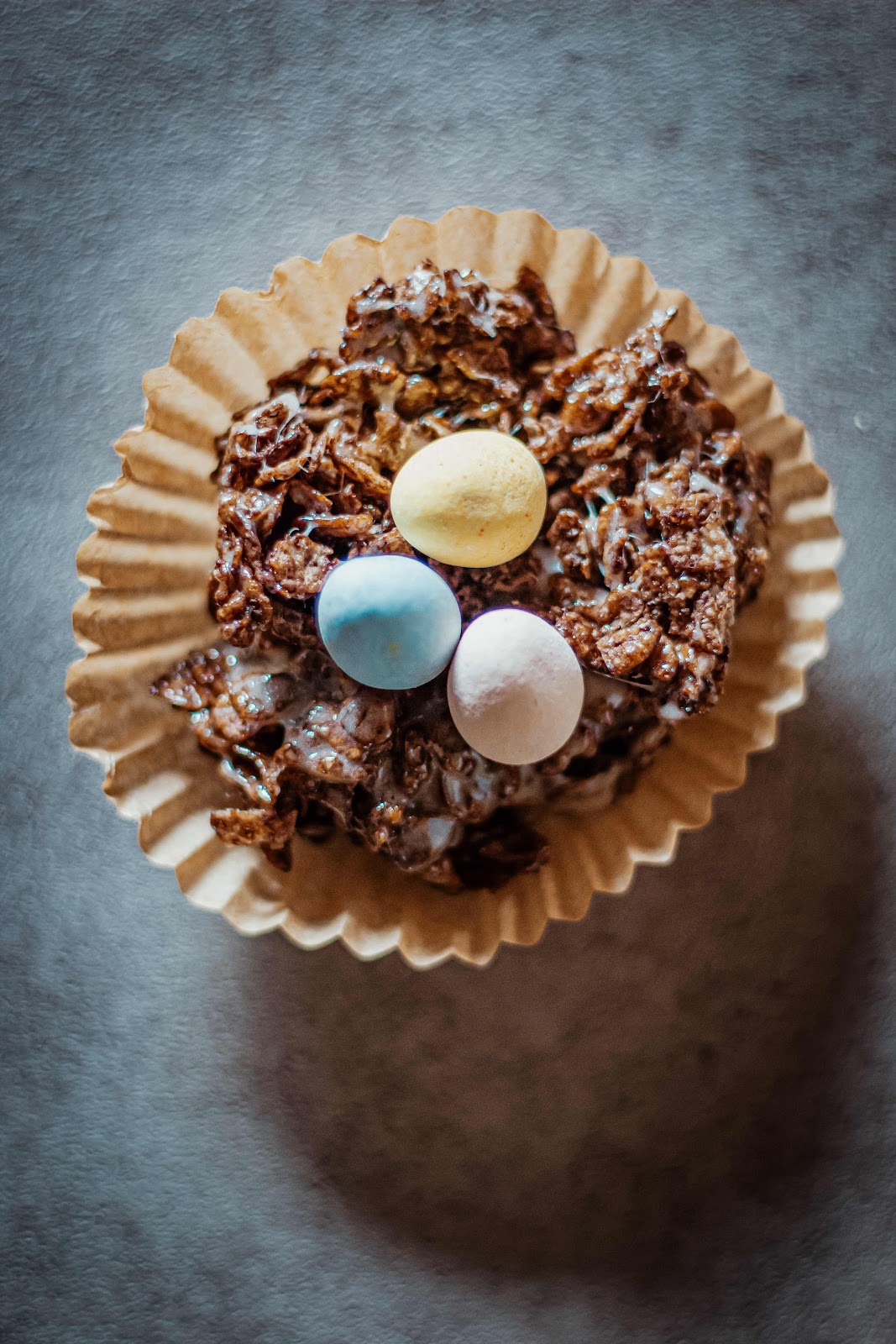 BIRDS NEST TREATS. You'll need 5 cups Cocoa Pebbles + 4 cups marshmallow + 1/4 stick of butter melted + Cadbury eggs (or something similar ) // melt butter add mallows and stir. Once liquid add pebbles. Place in a cupcake tin (sprayed or lined to prevent sticking) once cooled add eggs. Eat + enjoy! #easter #eastertreats #eastereggs #eastereggideas #birdsbestsnack #birdsnesttreat #cadburychocolate #cadburyeggs #cocoapebbles
